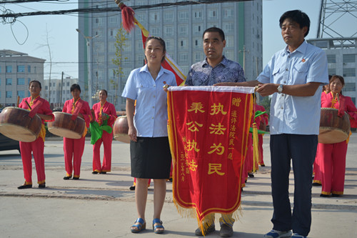 图为,8月20日,家住通许县的赵安国来到通许县人民法院,将一面写着“执法为民 秉公执法”的锦旗送到法官手中,对法院将10万元保险合同理赔款快立快审快执到位表示感谢。